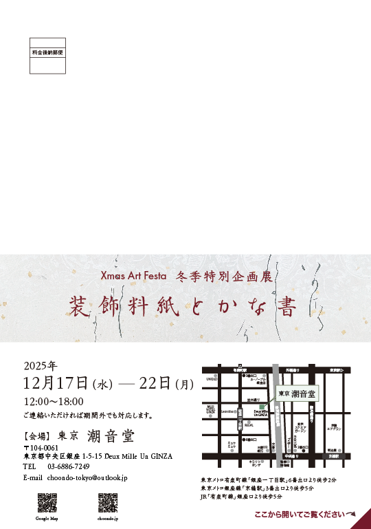 銀座1丁目の古筆、書画を専門とする東京 潮音堂さまの展覧会「装飾料紙とかな書」のパンフレットを制作させていただきました。